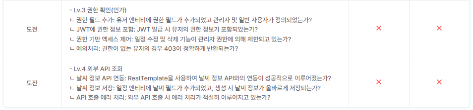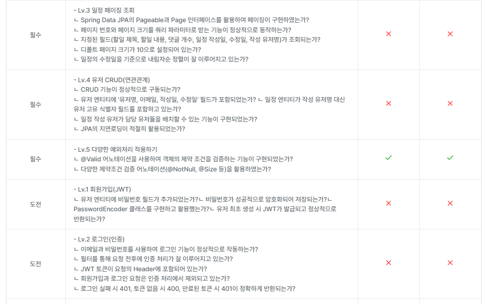 혼자의 힘으로 코드를 작성하는 연습이 필요할 것 같습니다. 개념은 어느정도 잡힌 것 같아서 주말을 이용해 강의를 보지 않고 코드를 작성해 보겠습니다.도메인별로 패키지를 나누는 것이 좋다는 피드백을 잊고 있다가 뒤늦게 생각이 났습니다. 다음부터는 도메인을 나누어 조금 더 보기 쉽게 작성해보도록 하겠습니다.why를 중심으로 주석을 달아보려고 했으나, 제출시간이 촉박해 주석을 제대로 달지 못했습니다. 이부분은 제출 후 다시 작성해보도록 하겠습니다. 연관관계를 설정하는 것이 어렵습니다. 추가 학습이 필요할것 같습니다.회원가입, 로그인, 인증인가 부분도 코드를 더 공부해보려고 합니다. (토큰부분을 조금 더 수정하고, 로그인 상태에서만 특정기능을 수행할수 있도록 하는 기능도 복습이 필요할 것 같습니다.)예: 로그인 상태에서만 댓글 삭제하기문제 해결 과정을 첨부하도록 하겠습니다.