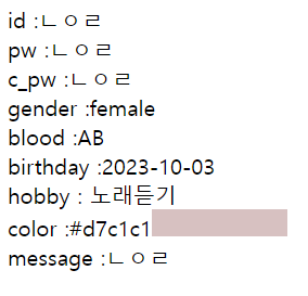 // POST방식 디코딩(코드 -> 문자) html에서 utf-8로 보내서 utf-8로 받음 request.setCharacterEncoding("UTF-8"); //데이터 받아오기 String id = request.getParameter("id"); String pw = request.getParameter("pw"); String pwCheck = request.getParameter("pwCheck"); String gender = request.getParameter("gender"); String blood = request.getParameter("blood"); String birthday = request.getParameter("birthday"); String hobby [] = request.getParameterValues("hobby"); String color = request.getParameter("color"); String board = request.getParameter("board"); //웹에 출력하기 response.setContentType("text/html;charset=utf-8"); PrintWriter out = response.getWriter(); out.print("<style>div{background-color:"+color+";" +"width:100px; height:20px;" +"display : inline-block;}</style>"); out.print("id :"+ id +"<br>"); out.print("pw :"+ pw +"<br>"); out.print("c_pw :"+ pwCheck +"<br>"); out.print("gender :"+ gender +"<br>"); out.print("blood :"+ blood +"<br>"); out.print("birthday :"+ birthday +"<br>"); out.print("hobby : "); for(int i = 0; i<hobby.length; i++) { out.print(hobby[i]+" "); } out.print("<br>"); out.print("color :"+ color); out.print("<div></div><br>");