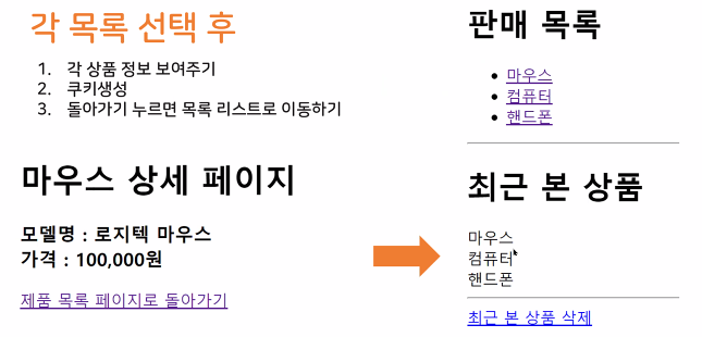 </ul> <hr> <h1> 최근 본 상품</h1> <% //최근 본 상품 조회 // 1. 쿠키 조회 Cookie[] cookies = request.getCookies(); // 2. 쿠키 이름에 item이 있다면 웹에 출력 // for(int i = 0 ; i < cookies.length; i++){ // if(cookies[i].getName().contains("item")){ // out.print(URLDecoder.decode(cookies[i].getValue(),"UTF-8")); // } //} for(Cookie c :cookies){ //만약에 쿠키이름에 item 들어있다면 // if 쿠키이름.contains("item") if(c.getName().contains("item")){ //웹에 출력 -> 디코딩 out.print(URLDecoder.decode(c.getValue(),"UTF-8")+"<br>"); } } %> <hr> <a href="Delete.jsp">최근 본 상품 삭제</a>