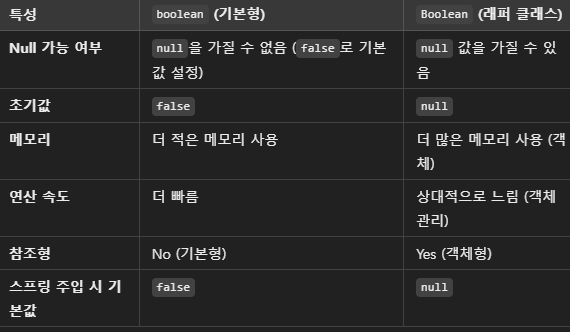 => null 값을 허용하고 싶다면 Boolean을 사용하는 게 적합