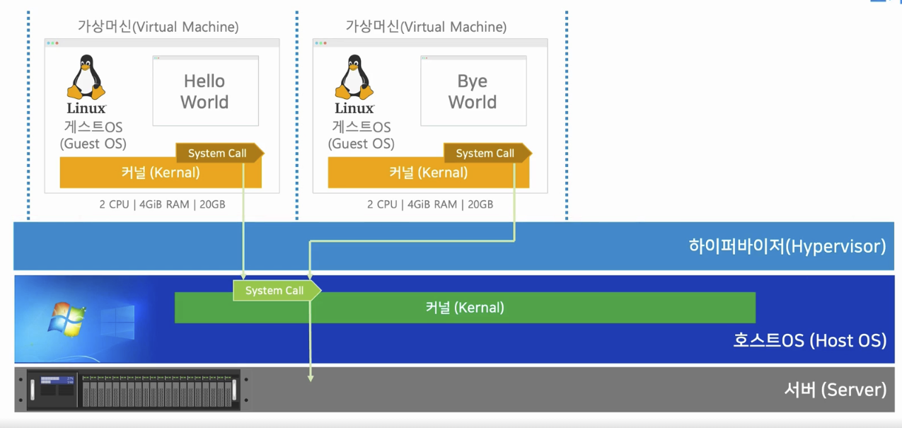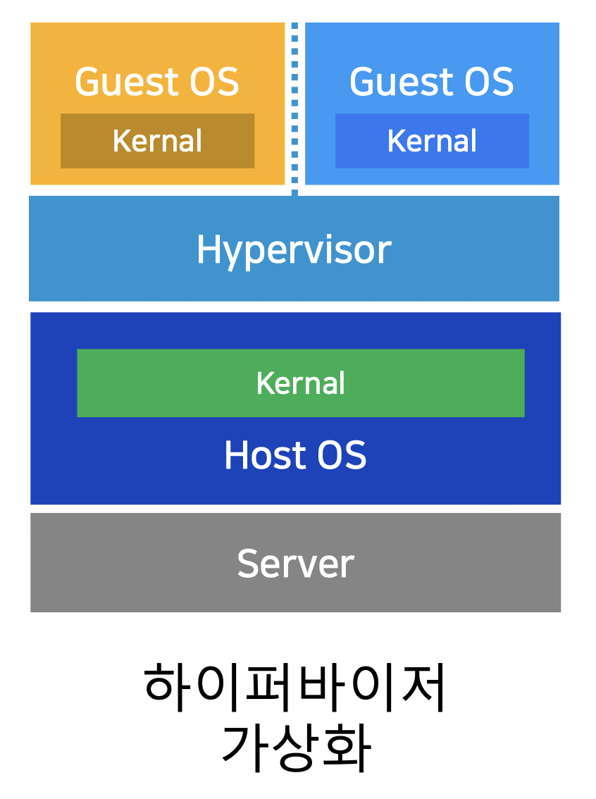 이전에 봤듯 하이퍼바이저는 호스트 OS와 게스트 OS의 커널이 독립적으로 존재했다. 그리고 하이퍼바이저가 중간에서 통역을 해주어 단계가 늘어났다(오버헤드가 크다). 아래 사진은 각각 커널이 존재하는 하이퍼바이저 사진이다.