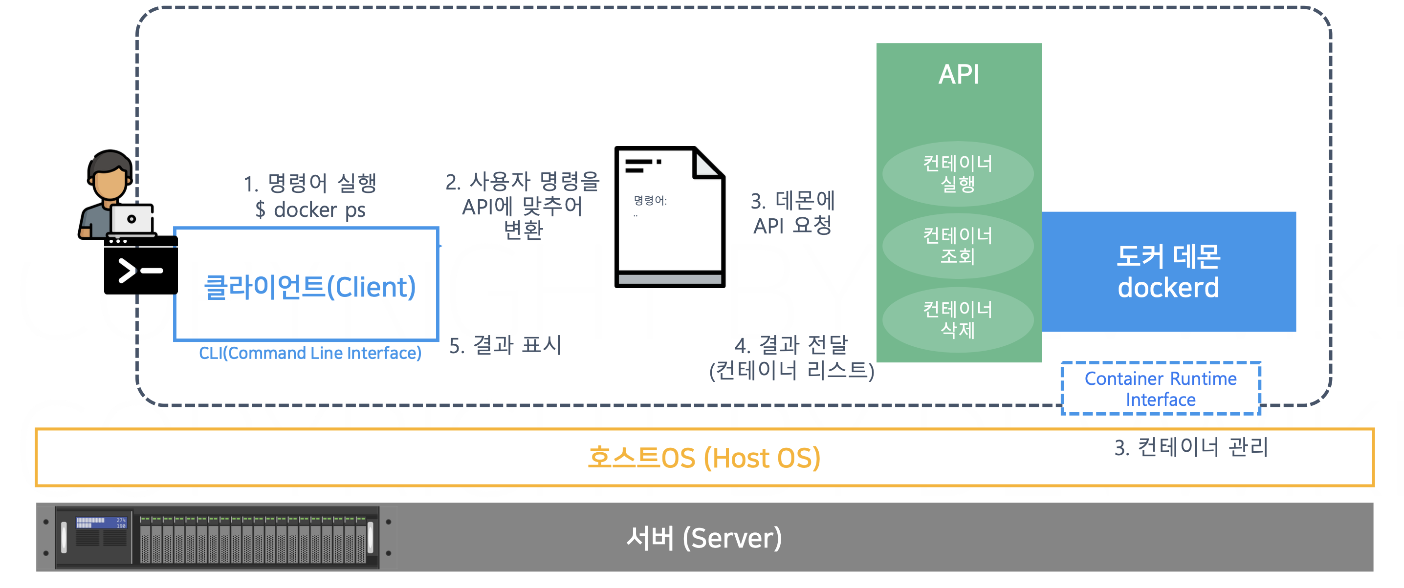 클라이언트는 사용자의 명령을 도커 데몬에게 전달한다. 도커 데몬은 컨테이너를 관리하고, 도커 D라고도 한다. 이 도커 데몬은 클라이언트가 컨테이너를 관리할 수 있도록 API를 제공한다. API는 상호간의 약속을 뜻한다.