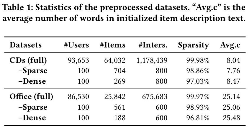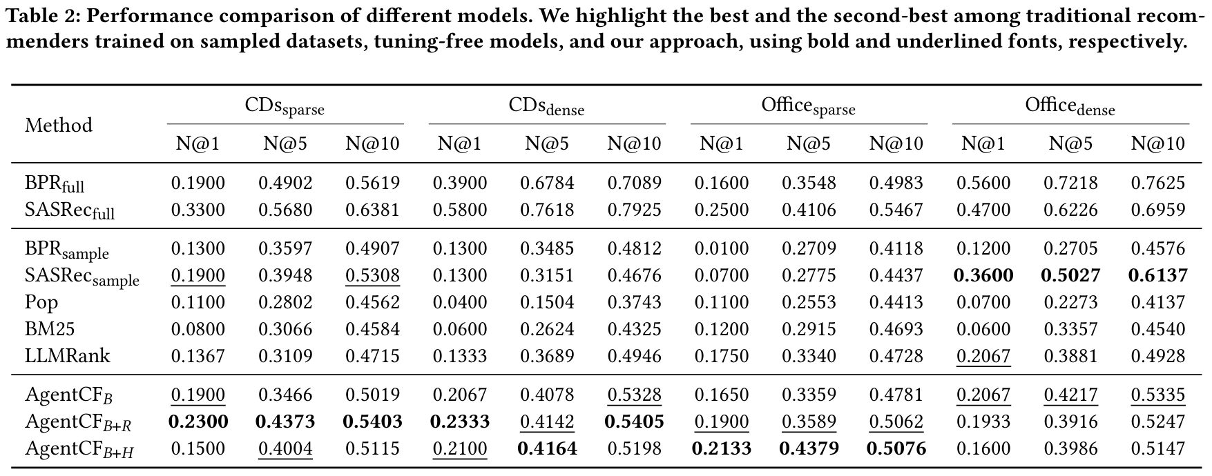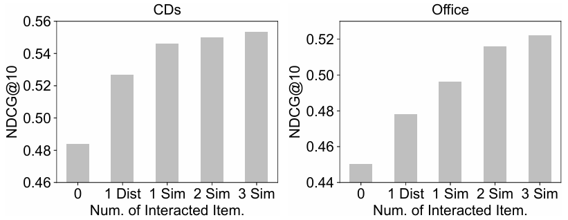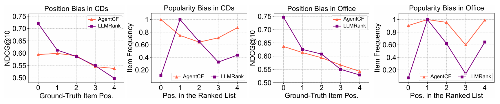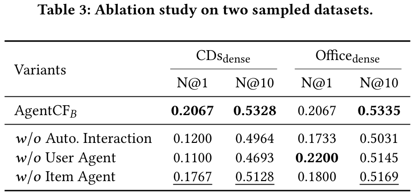 또한, Office 데이터셋이 item description text가 더 길기 때문에, LLM이 활용할 수 있는 자연어 정보가 많아지는 효과가 있습니다. 이로 인해 전반적으로 Office가 CD보다 LLM 기반 모델들의 성능이 더 높게 나타납니다(예: LLMRank, AgentCF 변형들). 즉, 충분한 텍스트 설명이 제공될수록 LLM이 사용자·아이템 메모리(및 과거 행동)에 대한 추론을 풍부하게 수행할 수 있어 개인화 품질이 더 좋아진다는 점을 확인할 수 있습니다.