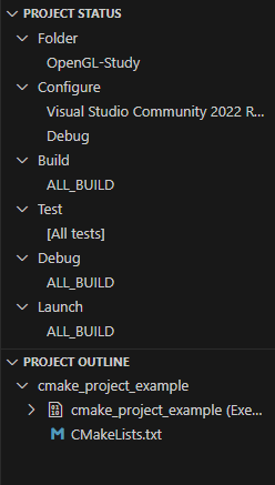 - 화면 좌측에 추가로 생긴 cmake 탭에서 원하는 기능 실행