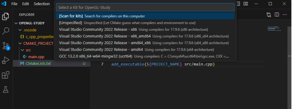 - Ctrl + Shift + P 를 눌러 CMake: Configure - Window 버전에 맞게 선택