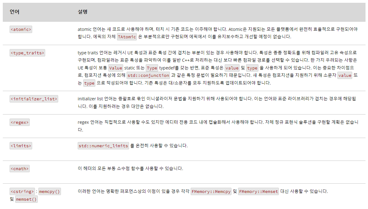- 언리얼 엔진은 기본적으로 C++20 언어 버전으로 컴파일하며, 빌드 시 요구하는 최소 언어 버전은 C++17입니다. 언리얼 엔진은 최신 컴파일러 전반에서 잘 지원되는 다수의 최신 언어 기능을 사용합니다.