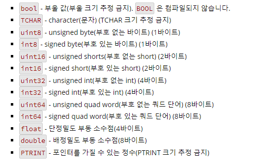 - int 및 부호 없는 int 타입은 플랫폼에 따라 크기가 다를 수 있습니다. 최소 너비는 32비트로 보장되며, 정수 너비가 중요치 않은 경우라면 코드에서 사용해도 괜찮습니다. 명시적으로 크기가 정해진 타입은 여전히 시리얼라이즈 또는 리플리케이트된 포맷으로 사용합니다.