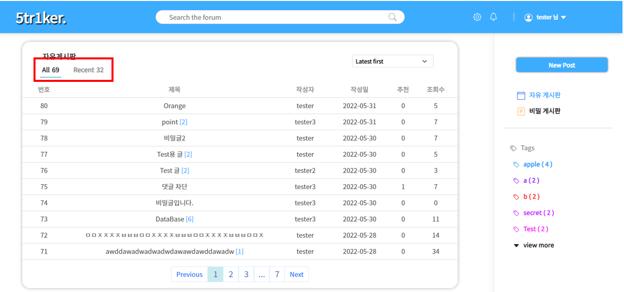게시글은 최근 등록순 , 많은 추천수 , 많은 조회수 순서로 정렬할 수 있으며, 각 옵션마다 내림차순으로 정렬이 됩니다. 오른쪽 하단의 네모 박스는 해시태그 요약이 있으며, 태그 데이터와 태그의 갯수를 요약하고 있습니다.
