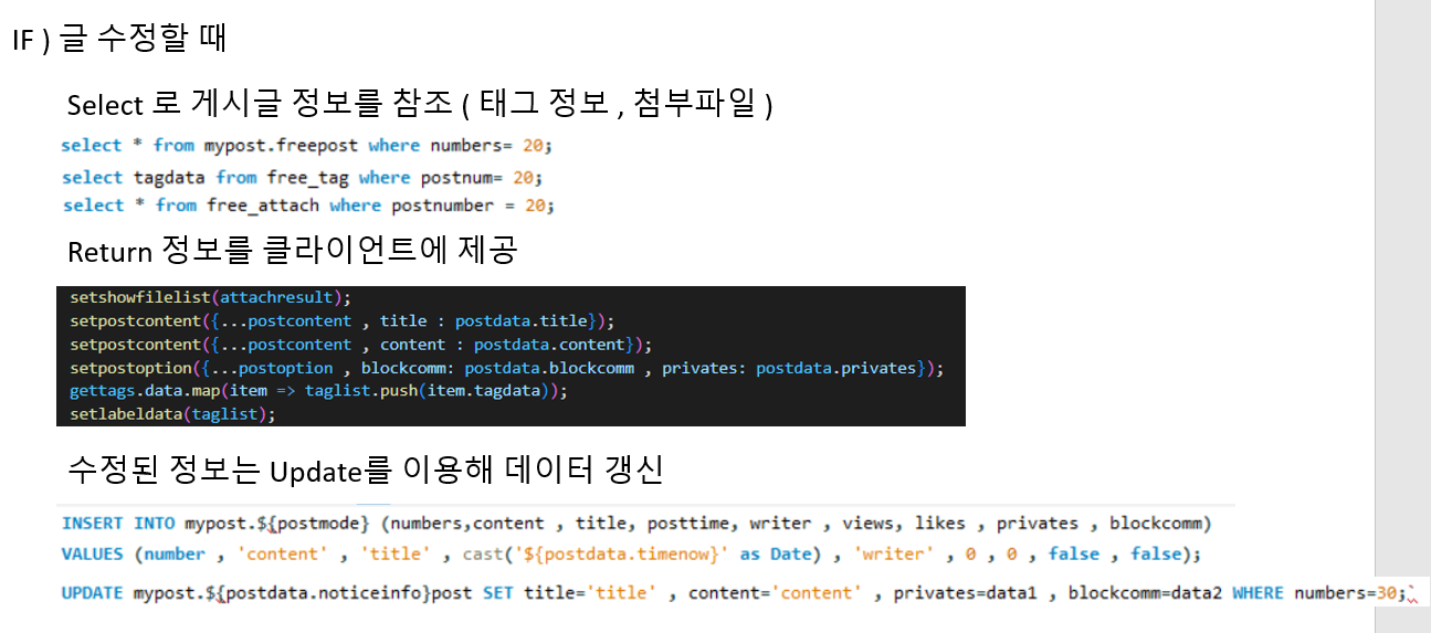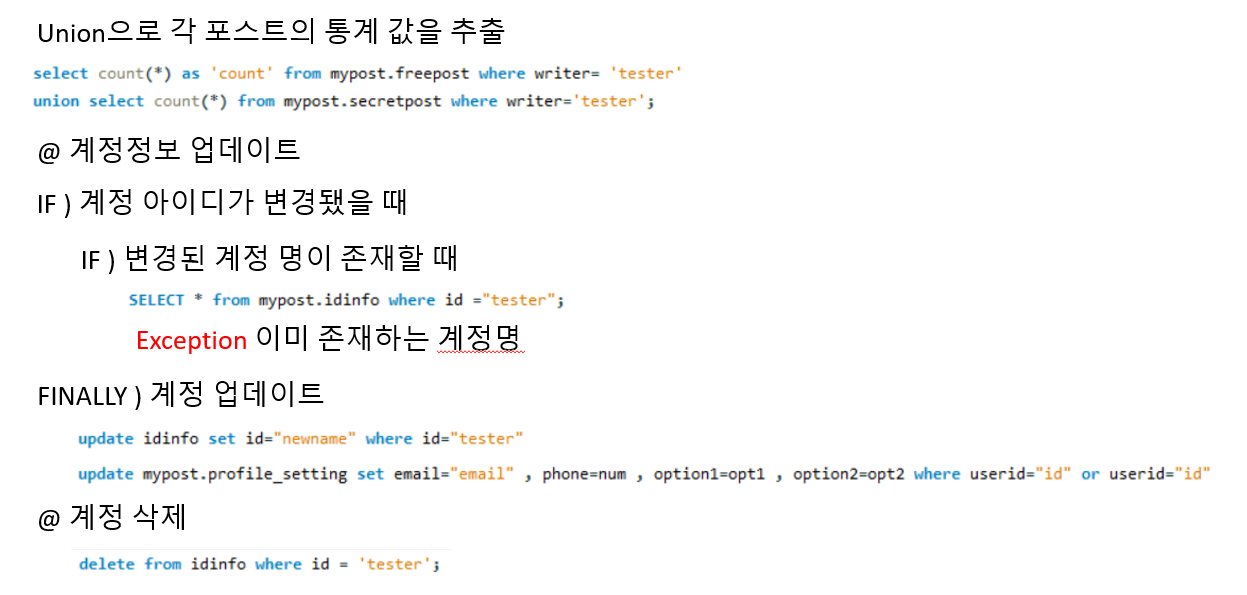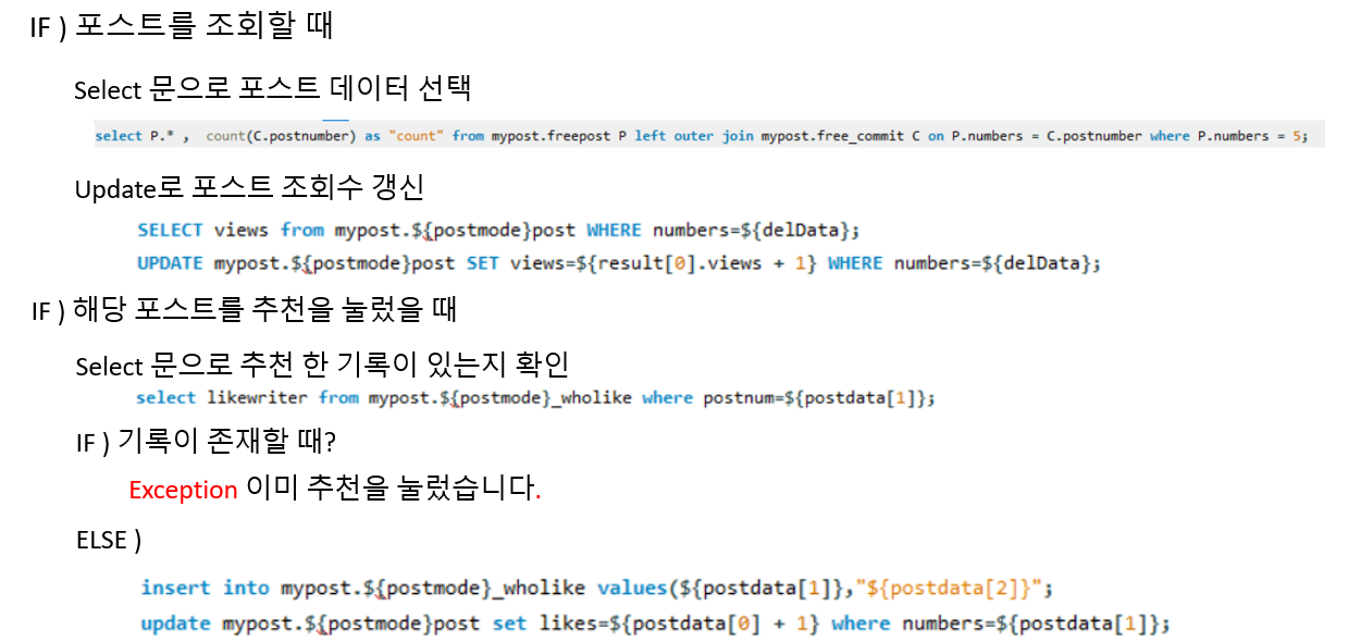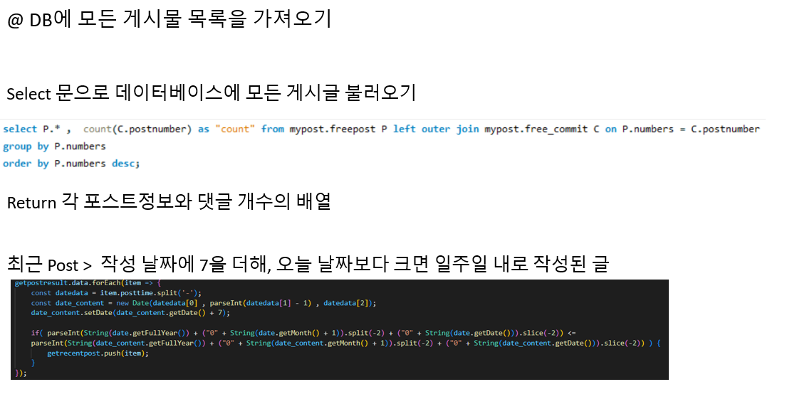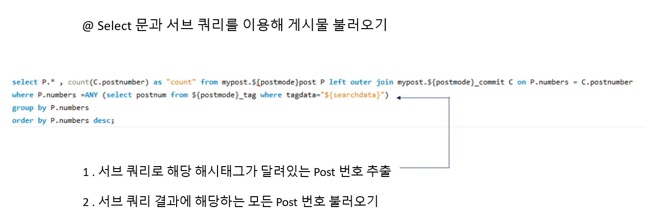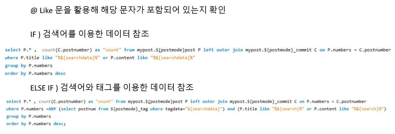 위에 태그 검색과 같이 첫번째 Select 줄에는 외부 조인과 집계함수 Count() , Group by를 이용해 각 포스트마다 댓글 개수를 반환하며 , 두번째 줄에서는 서브쿼리를 이용해 ANY 연산자로 태그에 해당되는 포스트와 두번째 서브쿼리에서는 Like문과 ANY연산자를 이용해 제목과 내용에 해당 내용이 포함되어 있는 포스트를 반환합니다.