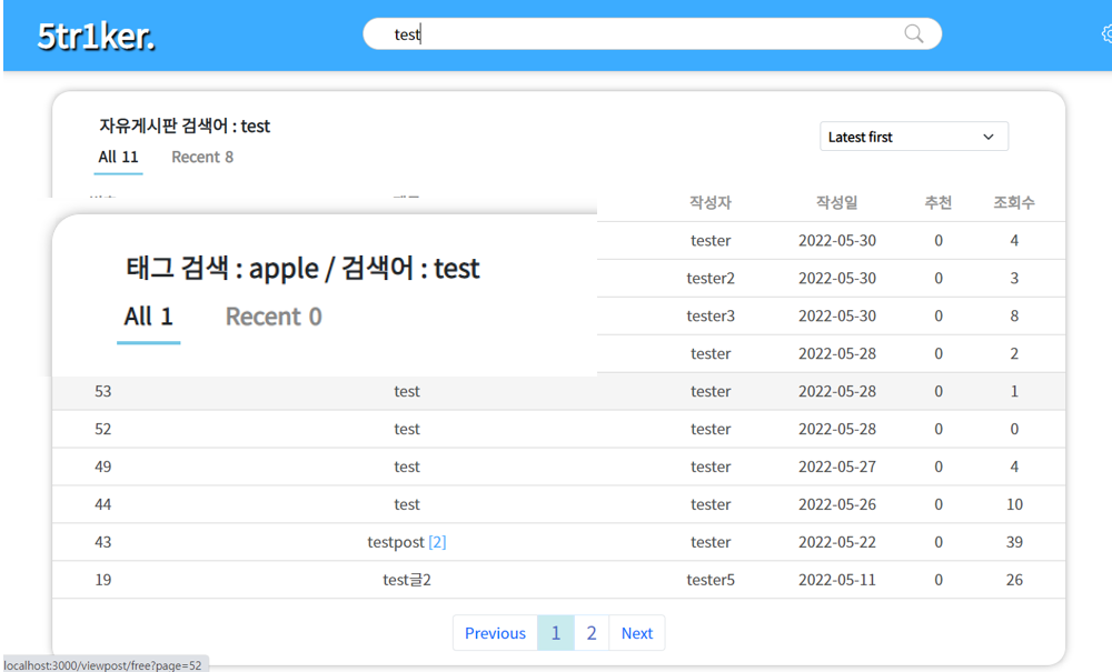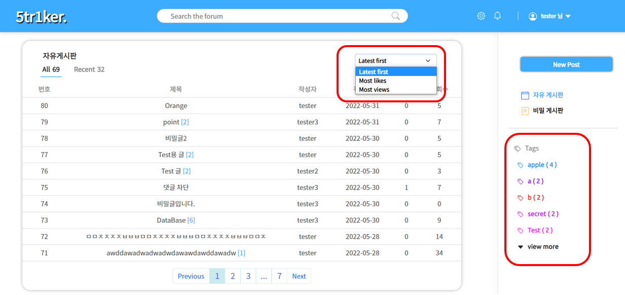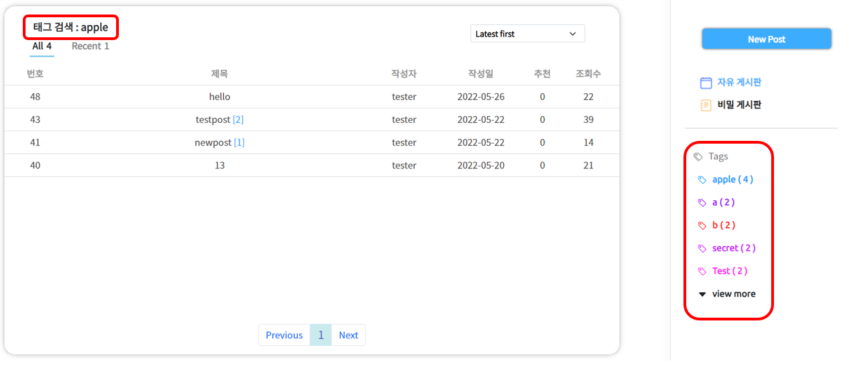 상단 프레임에 있는 검색어를 통해 제목이나 내용에 해당 내용이 포함되는 게시글을 전부 가져옵니다. 또한 태그 검색을 할 때 검색어를 통해 게시글을 찾을 수 있습니다.