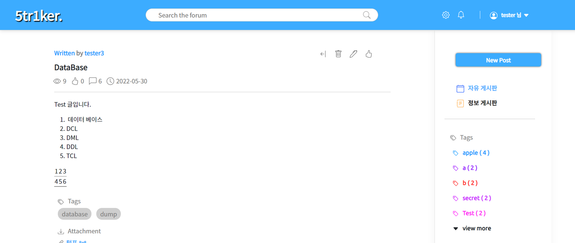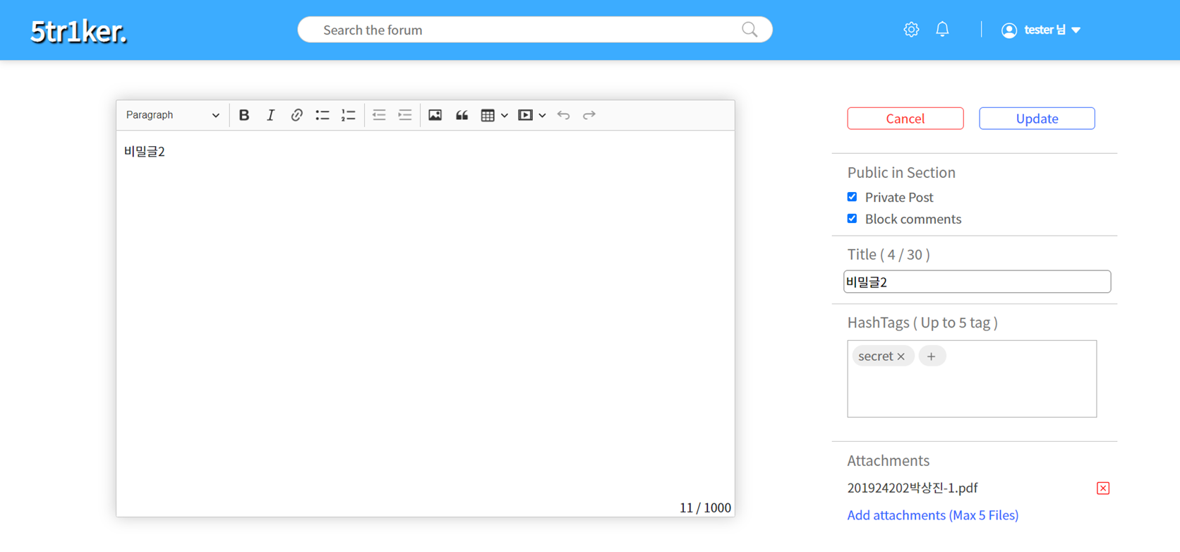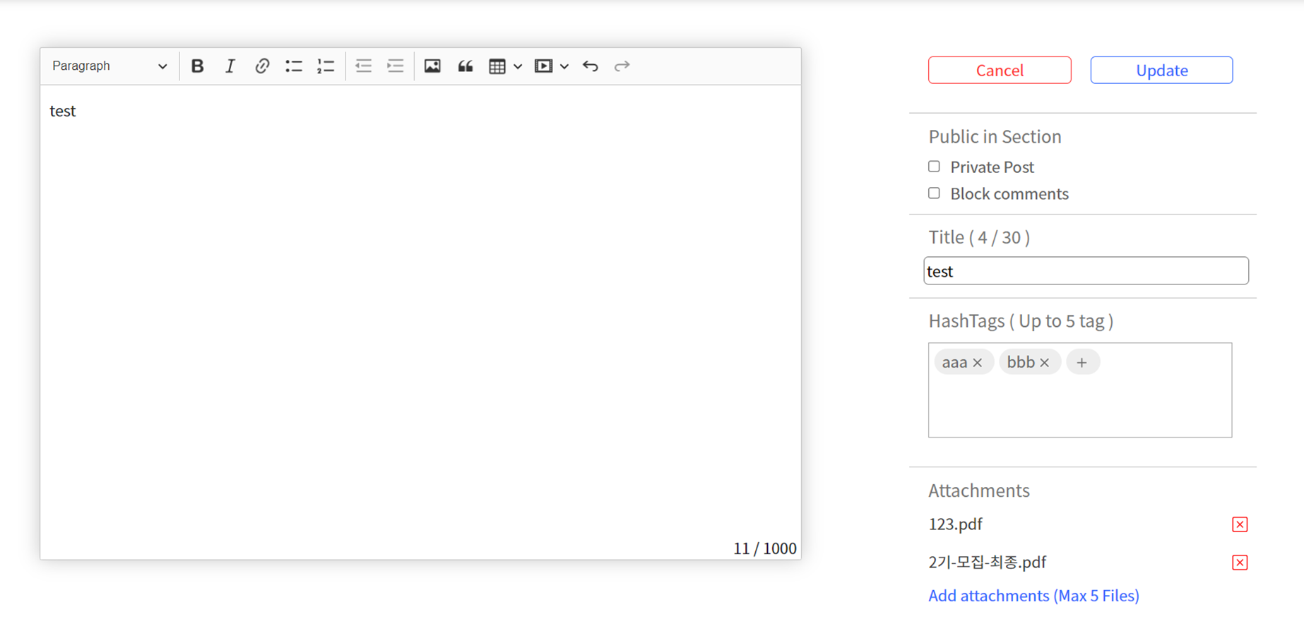 new post를 눌러 새 글을 등록할 수 있습니다. 왼쪽에 텍스트 에디터를 통해 글을 작성할 수 있으며 , 오른쪽에 글 옵션을 통해 게시글의 옵션을 바꿀 수 있습니다. 우선 작성취소 cancel 버튼과 글 출간 update 버튼이 있으며 , 그 밑에 Public in Section 구역에는 비밀글 설정인 Private Post 와 댓글 차단인 Block comments 가 있습니다. 하단이 Title 구역에서 글 제목을 정할 수 있으며 , 그 밑에는 HashTag를 작성할 수 있습니다 + 버튼을 눌러 원하는 내용을 작성을 하며 x 버튼을 눌러 해시태그를 삭제할 수 있습니다. 하단에 Attachments 는 첨부파일을 등록하는 기능으로 add attachments 버튼을 눌러 첨부파일을 추가할 수 있으며 , 등록된 첨부파일은 x 버튼 를 통해 제거할 수 있습니다.