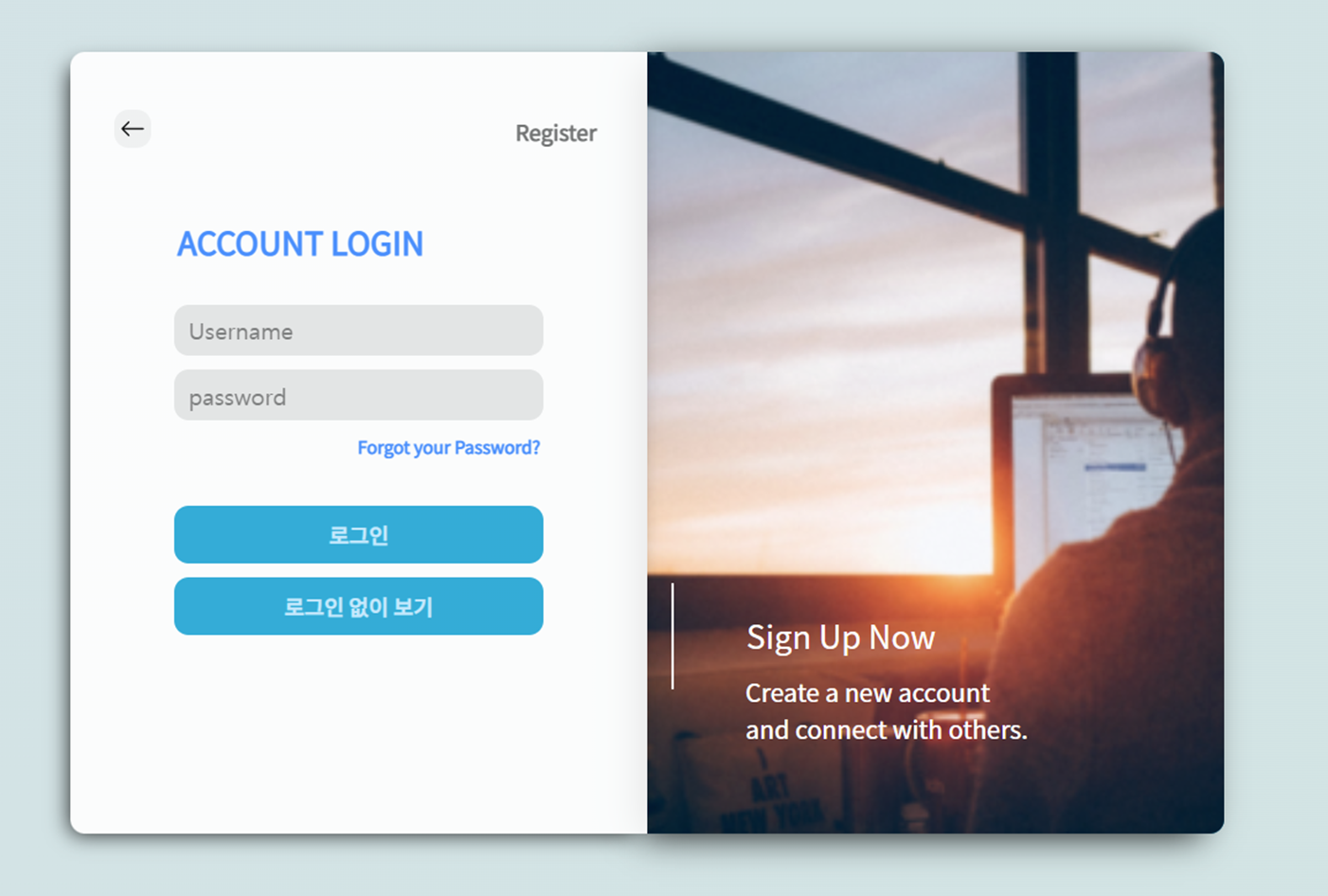로그인 창에 접속시 보이는 화면입니다. username 과 password를 입력을 받고 로그인 버튼을 누르면 서버에서 데이터를 전송해 해당 데이터가 유효한지 검사를 받게 됩니다. 로그인 없이 보기 로 아이디 없이 볼 수 있으나, 게시물 사용시 이용이 제한될 수 있습니다.