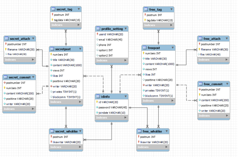 ( 기본키 ) 게시글 번호 ( numbers )( 외래키 ) 작성자 ( writer )( 외래키 , 기본키 ) 게시글 번호 ( postnum )( 기본키 ) 해시태그 데이터 ( tagdata )( 외래키 , 기본키 ) 게시글 번호 ( postnum )( 기본키 ) 파일이름 ( filename )( 외래키 ) 게시글 번호 ( postnum )( 기본키 ) 댓글 번호 ( numbers )( 외래키 , 기본키 ) 게시글 번호 ( postnum )( 외래키 , 기본키 ) 추천자 아이디 ( likewriter )