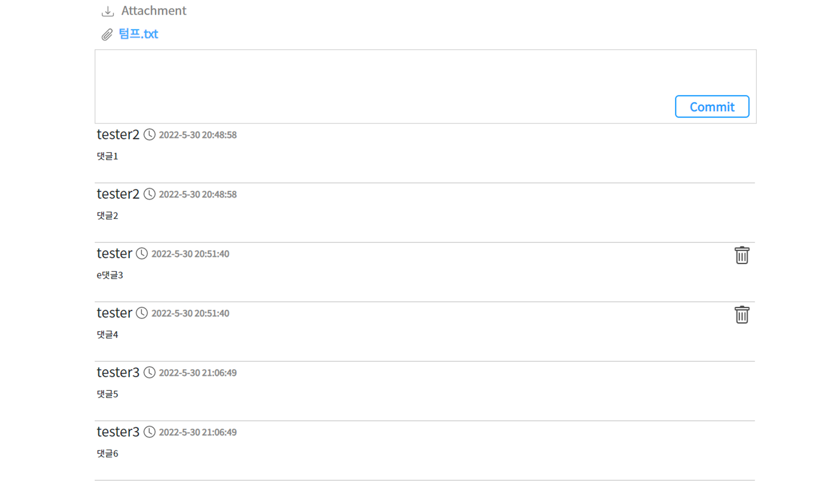 게시글 조회 하단에 댓글 작성창과 댓글이 있습니다. text 창에 댓글을 작성 후 Commit 버튼을 눌러서 댓글을 작성할 수 있습니다. 작성된 댓글은 하단에 나타나며 , 댓글 삭제는 쓰레기통 모양의 버튼을 눌러 삭제할 수 있습니다. 단 삭제 버튼은 본인이 작성한 댓글에만 나타납니다.