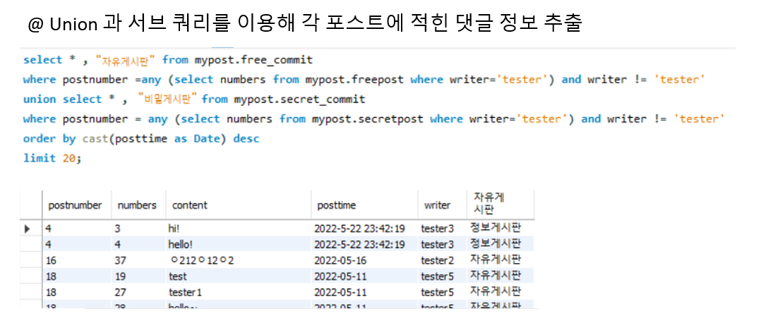 서브 쿼리를 이용해 내가 작성한 글의 번호를 select로 추출한 다음에 ANY연산자로 댓글 데이터를 전부 추출합니다. 다만 댓글 작성자가 본인인 댓글은 뽑지 않습니다. 이 과정을 Union을 이용해 다른 게시판에서도 데이터를 추출합니다.