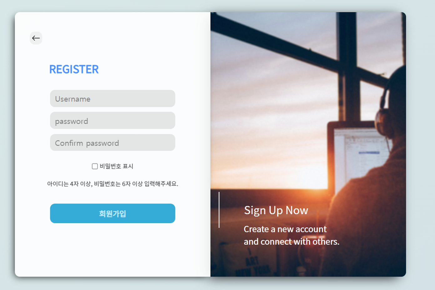아이디를 만들때 필요한 정보인 username 과 password를 입력받습니다. 비밀번호 표시를 통해 본인이 작성한 비밀번호를 확인할 수 있으며, 하단 라벨에 적힌 조건에 만족하는 데이터를 작성 후 회원가입 을 누르면 계정이 생성됩니다.