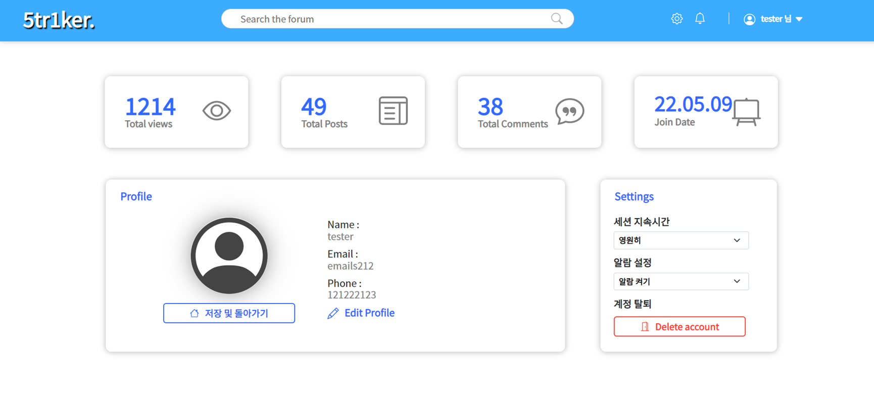 프로필 화면 상단에는 통계치가 나오며 , 자신이 작성된 모든 글에 대한 조회수와 , 작성한 게시글 수 , 작성한 댓글 수와 가입일자를 나타내고 있습니다. 하단에는 프로필 정보가 있으며 Edit Profile 버튼을 눌러 개인 정보를 수정할 수 있습니다. 오른쪽에는 설정을 할 수 있으며 , 로그인 지속시간과 알람 설정으로 알림을 받을건지 여부를 선택 할 수 있습니다.