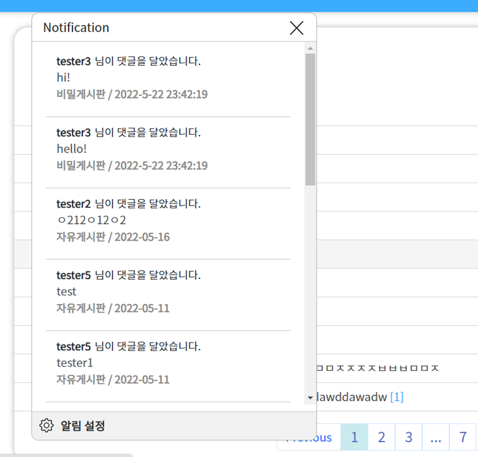 본인이 작성한 게시글에 등록된 댓글이 생기면 알림에 정보가 나타납니다. 본인이 작성한 댓글은 나타나지 않으며 작성자가 어떤 게시판에서 몇시에 어떤 글을 작성했는지 나타나며 , 해당 알림을 누르면 댓글이 작성된 게시글로 이동이 됩니다. 하단에 알림 설정은 프로필로 연결됩니다.