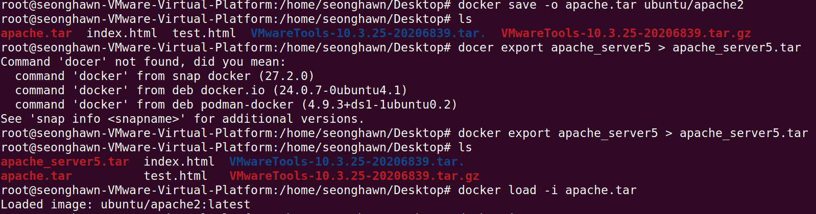 docker export apache_server5 > apache_server5.tar // 컨테이너 추출