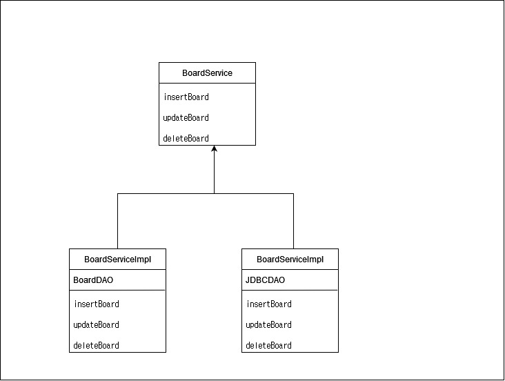 (예를 들어 jdbcboardDAO에서 만약에 문제가 생겨서 수정을 해야할 상황이 온다 치자. 그러면 BoardServiceImpl에서도 문제가 발생할 확률이 매우 높다. 아무 상관없는 boardDAO 빈 객체만 불쌍할 뿐이다.)
