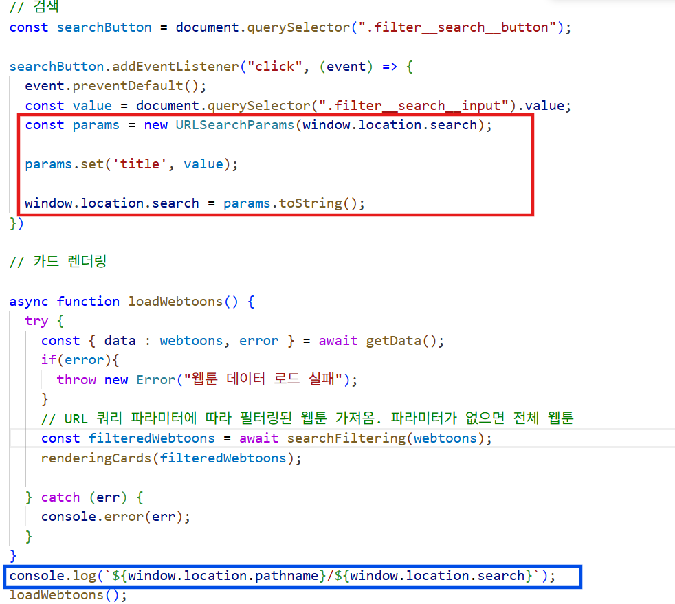 아래의 코드는 웹툰 리스트에서 검색어를 입력하면 URL에 QueryParameter 가 추가되어 해당 QueryParameter 를 읽어 검색했던 웹툰을 필터링해서 보여준다.