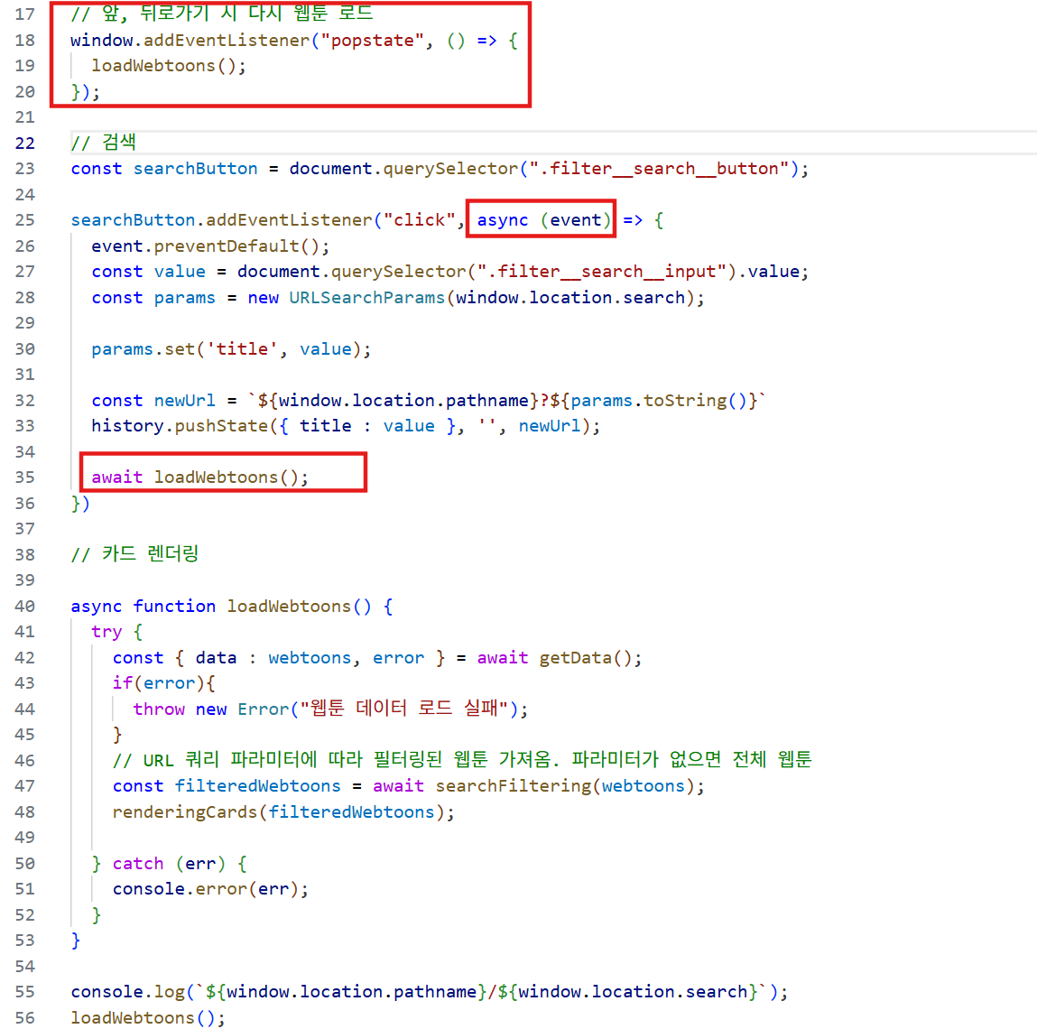 그리고 추가로 앞으로가기, 뒤로가기를 할 때에도 새로고침하지 않기때문에 loadWebtoons 를 수행해야한다.