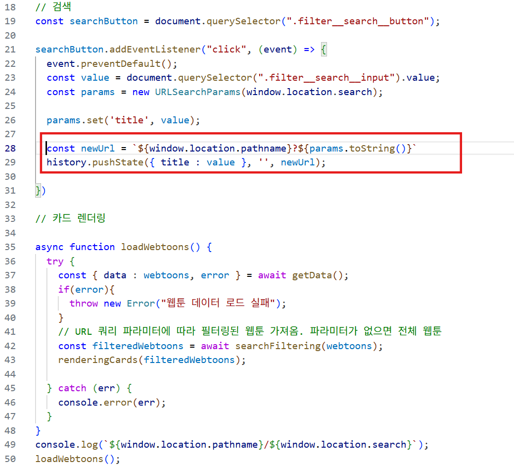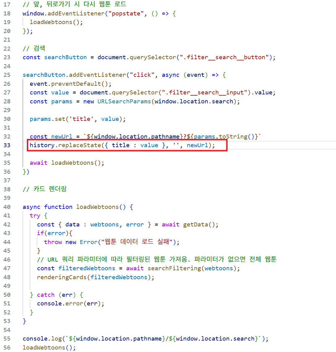 처음 pushState 로 바꾼 코드는 URL 은 잘 변경되었지만 검색 내용이 필터링되진 않았다.