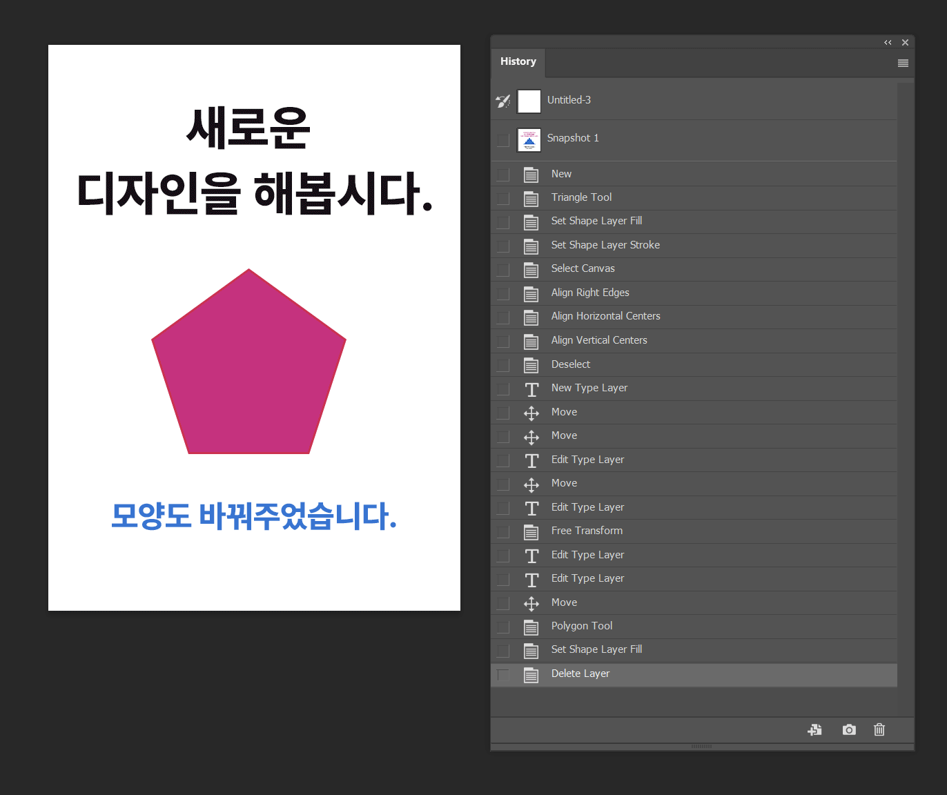 포토샵에서 히스토리는 작업 과정을 기록으로 남겨놓아 원하는 시점으로 돌아갈 수 있다. 혹은 그 당시에 어떤 작업을 했는지 확인도 할 수 있다.