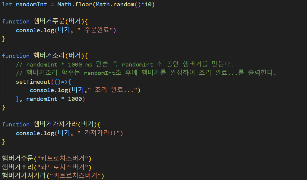 사실 우리는 예시를 쉽게 이해하기 위하여 randomInt 라는 변수에 햄버거를 만드는 시간을 저장해서 사용했지만 실제 상황에서는 햄버거든, 커피든, 네트워크에서 데이터를 가져오든 얼마나 시간이 걸리는지 알 수가 없다.
