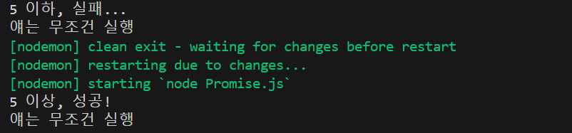 - randomNumber 가 5보다 작다면 실패로 간주해서 .catch에 전달한 콜백함수가 실행된다.