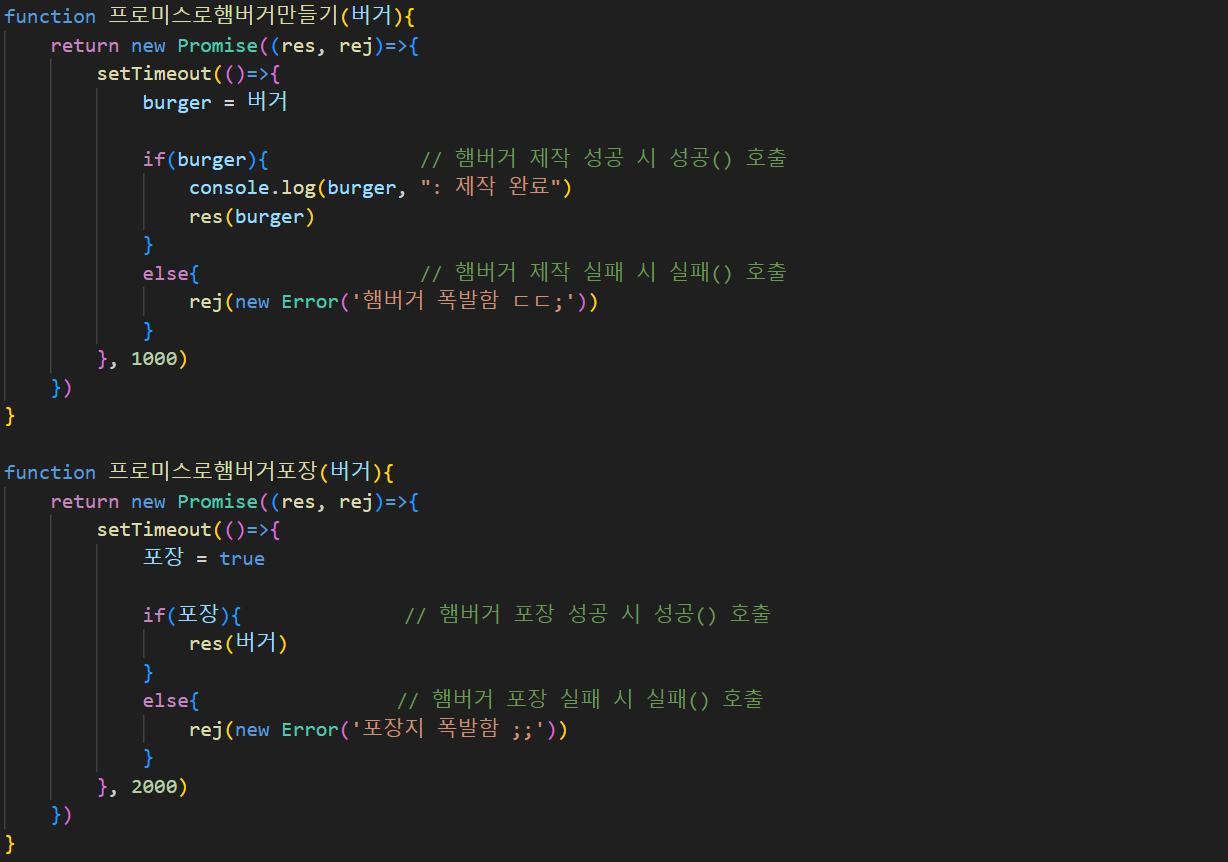 프로미스를 이용하여 햄버거만들기와 햄버거포장 함수를 만들 때도