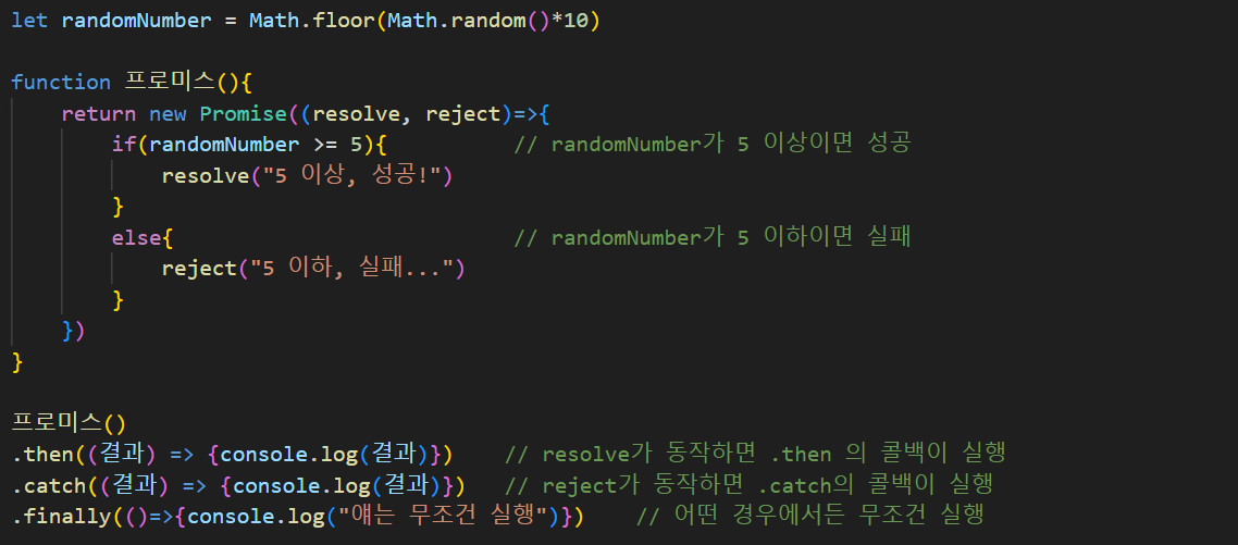 - randomNumber 가 5보다 크다면 성공으로 간주해서 .then에 전달한 콜백함수가 실행된다.