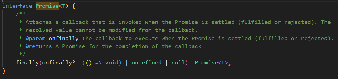 | settled | Promise가 resolved(해결) 되어지든 rejected(거부) 되어지든 이 콜백을 호출 | .finally() |