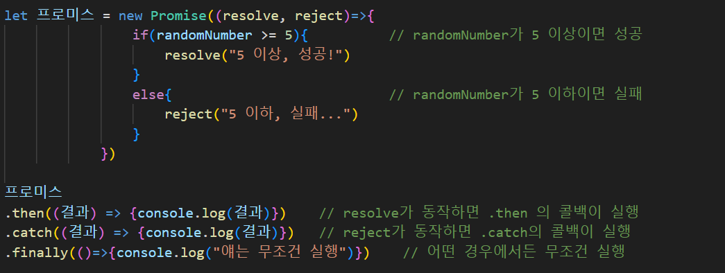 - 콜백 함수(작업)가 성공적으로 완료되었다면, resolve() 함수를 실행했다면 .then의 콜백 함수를 실행하며, 성공적으로 완료되지 않았다면 reject() 함수를 실행하여 .catch의 콜백 함수를 실행한다.