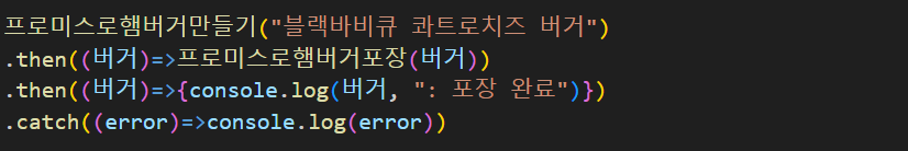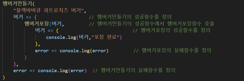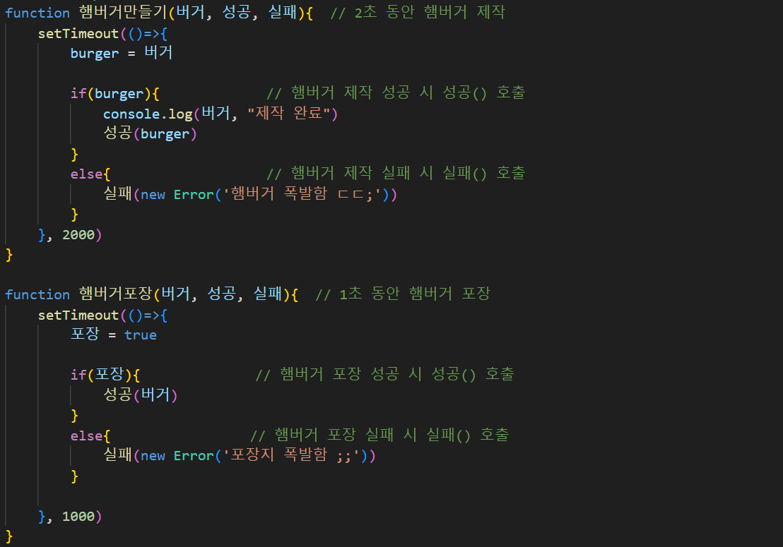 그리고 성공, 실패 함수를 햄버거만들기와 포장 함수에 전달할 필요가 없어졌다.