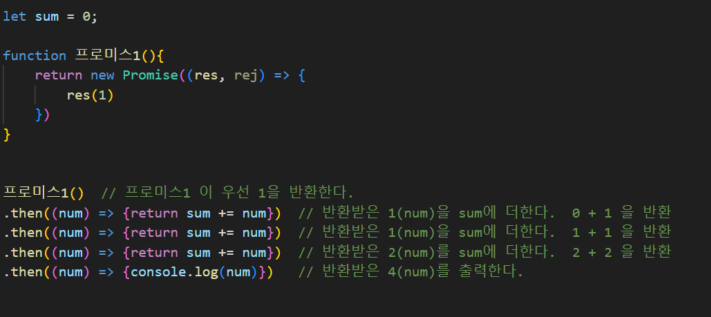 그리고 그 값은 .then((num) => {return sum += num}) 에서 붉게 표시한 부분이다.