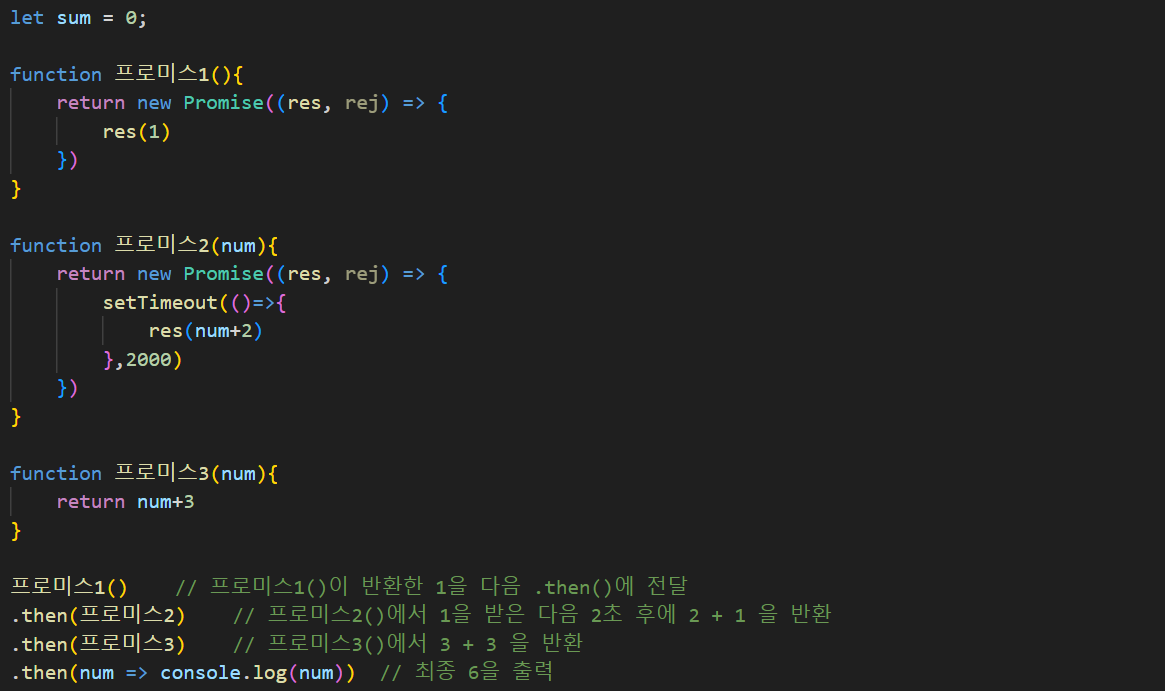 - 두 번째 .then()의 인자인 num 은 첫 번째 .then() 에서 반환한 sum 이다.
