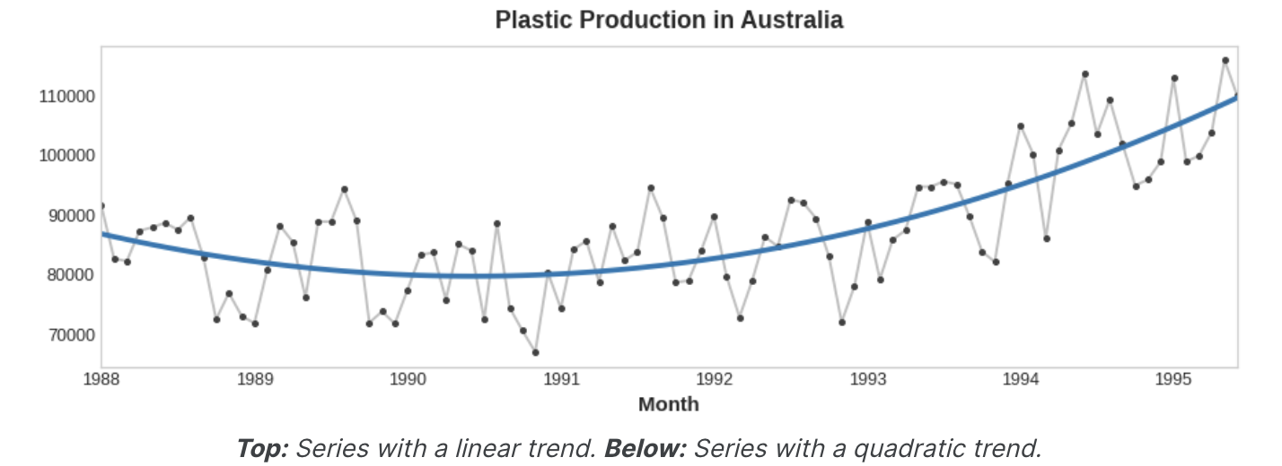 시간 더미의 변환을 통해 다른 많은 종류의 추세를 맞출 수 있다. 추세가 이차 함수(포물선)인 것 처럼 보이면 시간 더미의 제곱을 기능 집합에 추가하기만 하면 된다.