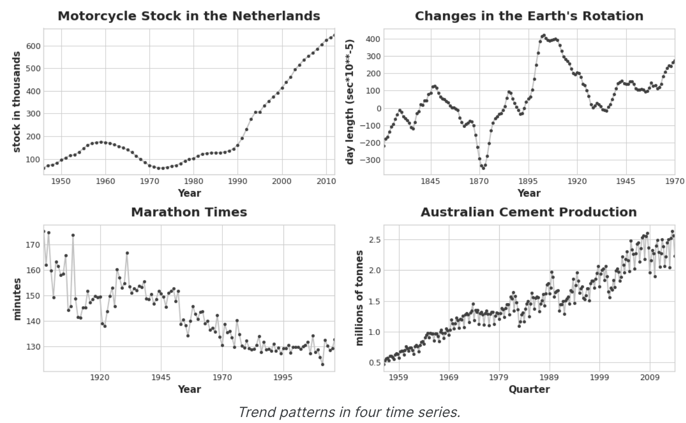시계열의 추세 구성 요소는 시계열 평균의 지속적이고 장기적인 변화를 나타낸다. 추세는 시계열에서 가장 느리게 움직이는 부분으로, 가장 중요한 시간 규모를 나타내는 부분이다. 제품 판매량의 시계열에서 추세가 증가하는 것은 해마다 더 많은 사람들이 제품을 알게되면서 시장이 확장되는 효과 일 수 있다.
