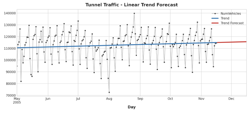 ax = tunnel["2005-05":].plot(title="Tunnel Traffic - Linear Trend Forecast", **plot_params)