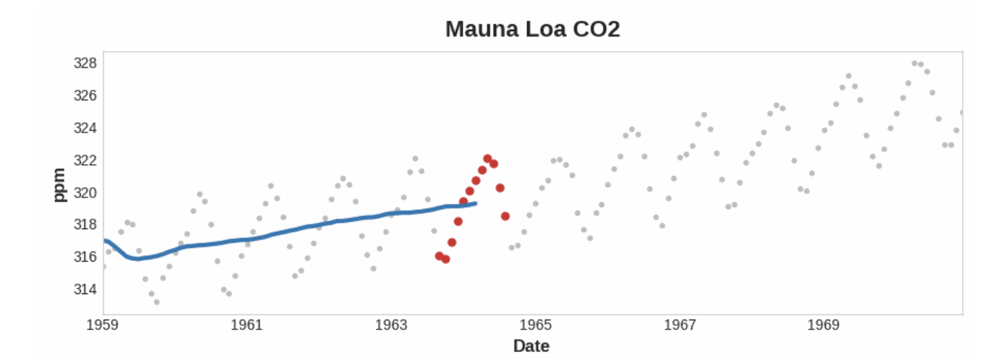 위의 Mauna Loa 시리즈에서 해마다 위 아래로 반복되는 움직임, 즉 단기적인 계절적 변화를 확인할 수 있다. 변화가 추세의 일부가 되려면 계절적 변화보다 더 긴 기간에 걸쳐 발생해야 한다. 따라서 추세를 시각화하려면, 시리즈의 계절적 기간보다 긴 기간의 평균을 취한다. Mauna Loa의 경우 각 연도의 계절을 부드럽게 표현하기 위해 12 크기의 창을 선택했다.