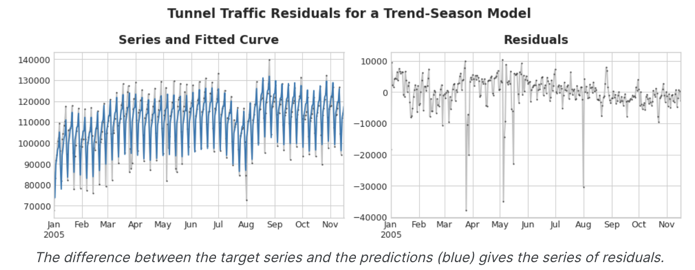 적합 곡선을 빼면 오른 쪽에 residual이 남는다. residual에는 Trend-seasonal 모델이 학습하지 못한 터널 교통량의 모든 것이 포함되어 있다.