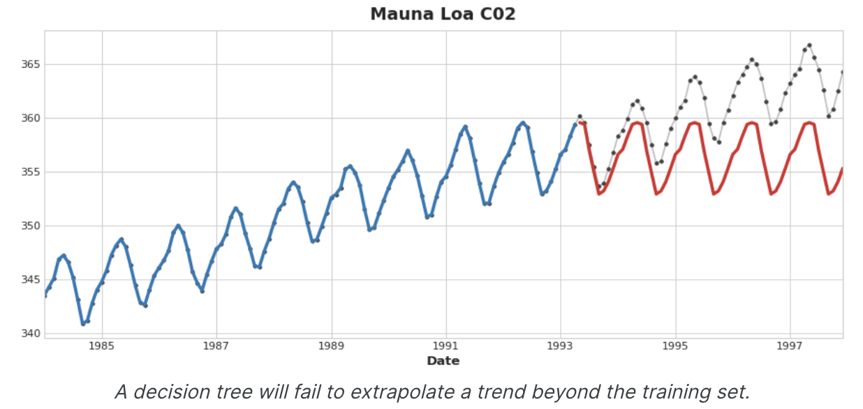 중요한 것은, feature transformers(특징 변환기)는 일반적으로 적절한 특징을 입력으로 주어지면 훈련 집합을 넘어 목표 값을 추정할 수 있지만, feature transformers의 예측은 항상 훈련 집합의 범위 내에 한정된다. time dummy가 time step을 계속 세는 경우 선형 회귀는 추세선을 계속 그린다. 동일한 시간 더미가 주어지면 의사 결정 트리는 학습 데이터의 마지막 단계가 나타내는 추세를 영원히 미래로 예측한다.