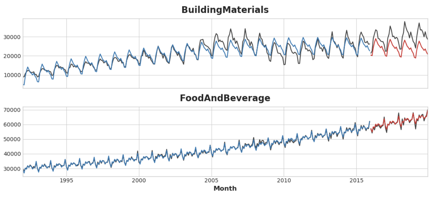 적합도는 상당히 좋은 것으로 보이나 XGBoost가 학습한 추세가 선형 회귀를 통해 학습한 추세만큼만 좋은 것을 볼 수 있으며, 특히 'BuildingMaterials' 시리즈에서 적합도가 좋지 않은 추세를 보완하지 못한 것을 알 수 있다.