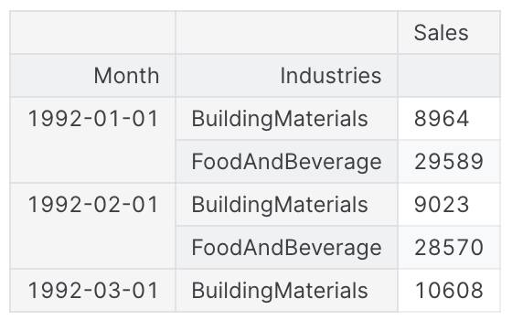 retail = pd.concat({'Sales': retail}, names=[None, 'Industries'], axis=1)