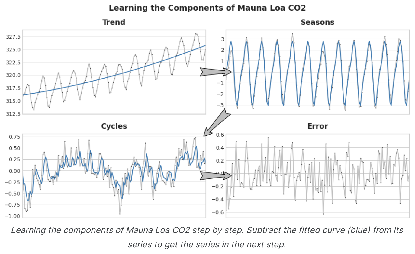 이전 단원에서는 단일 알고리즘(선형 회귀)을 사용하여 모든 구성 요소를 한 번에 학습했다. 하지만 일부 구성 요소에는 하나의 알고리즘을 사용하고 나머지 구성 요소에는 다른 알고리즘을 사용할 수도 있다. 이렇게 하면 항상 각 구성 요소에 가장 적합한 알고리즘을 선택할 수 있다.이를 위해 하나의 알고리즘을 사용하여 원래 시리즈에 맞추고 두 번째 알고리즘을 사용하여 나머지 시리즈에 마주는 것이다.