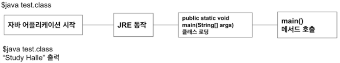 $ java test.class 또는 $ java test를 통해 .class파일을 실행시키면