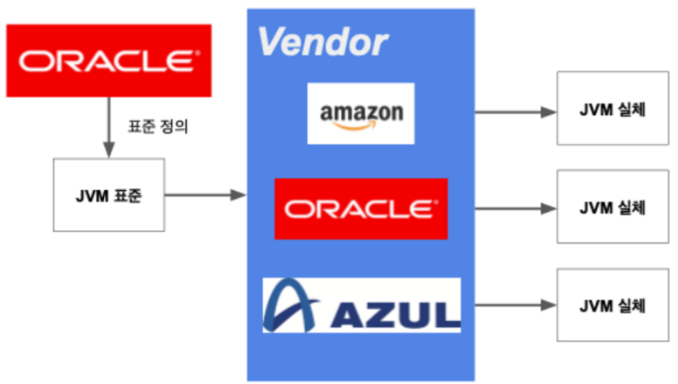 Oracle 이라는 회사가, JVM의 스펙과 표준을 정의하면, 공급업체들이, JVM을 실제 그래픽카드처럼 실물을 만들어서 배포하게 된다. 이 공급업체를 Vendor라고 한다