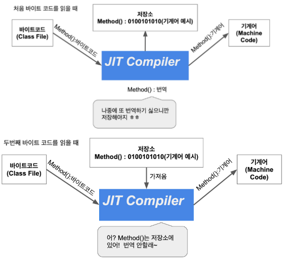 -> Java는 두 방식 모두 사용 => JIT 컴파일러의 도입