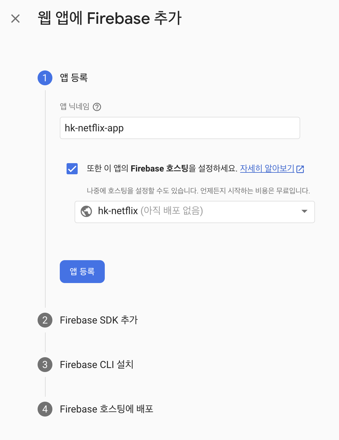 다시 웹으로 돌아와서 다음다음다음으로 넘기고 앱 생성을 완료한다.